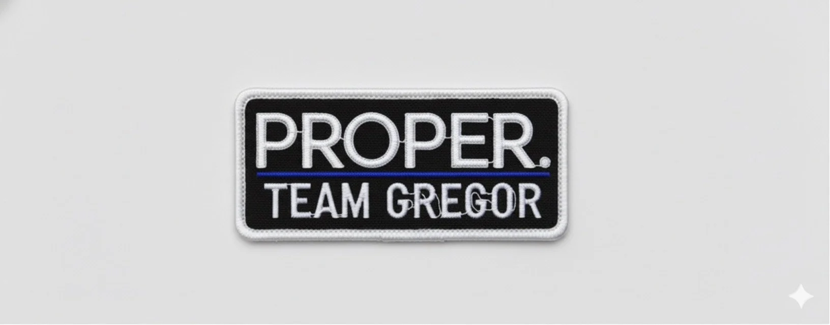 The Proper x Gregor Patches were created to represent the bond between fighter and brand — for those who live with purpose inside and outside the ring. Designed with Gregor’s Scottish heritage in mind, this embroidered patch features the bold PROPER. mark and TEAM GREGOR lettering, accented with a clean blue line to symbolize strength and loyalty. Add it to your gym bag, jacket, or gear — and wear the team with pride.
