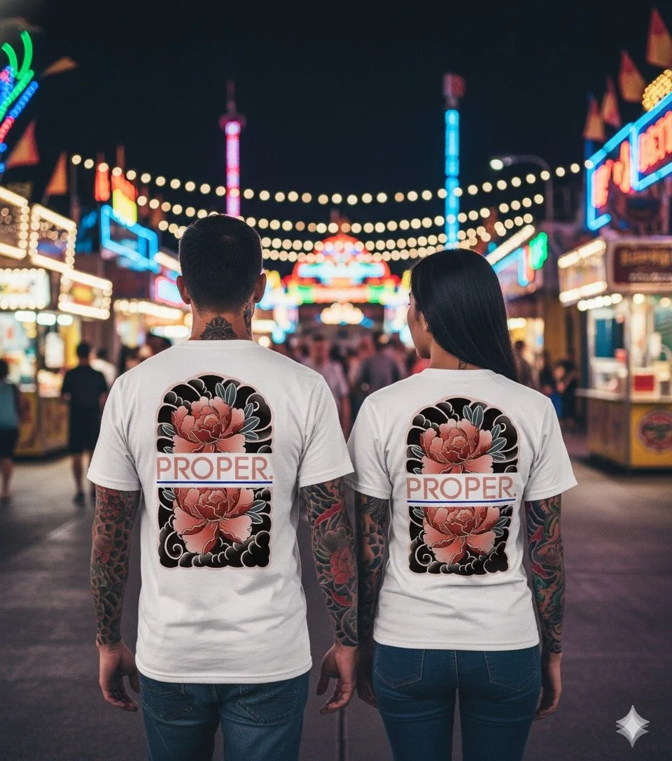 Traditional roots. Modern edge. The Proper Peony Tee blends classic tattoo florals with bold framing and the signature Proper mark. A clean canvas for everyday wear — from shop life to night lights.