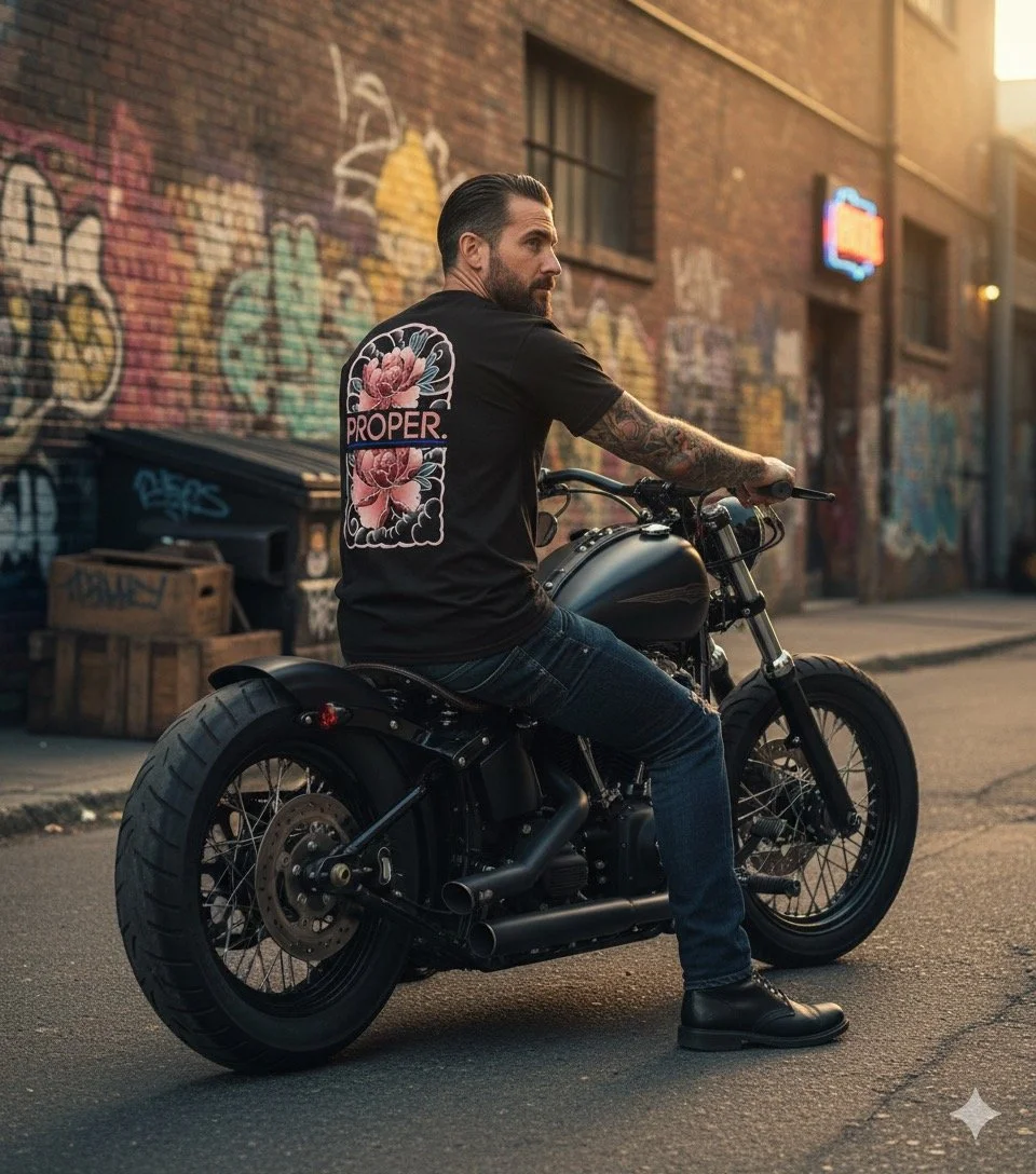 Traditional roots. Modern edge. The Proper Peony Tee blends classic tattoo florals with bold framing and the signature Proper mark. A clean canvas for everyday wear — from shop life to night lights.